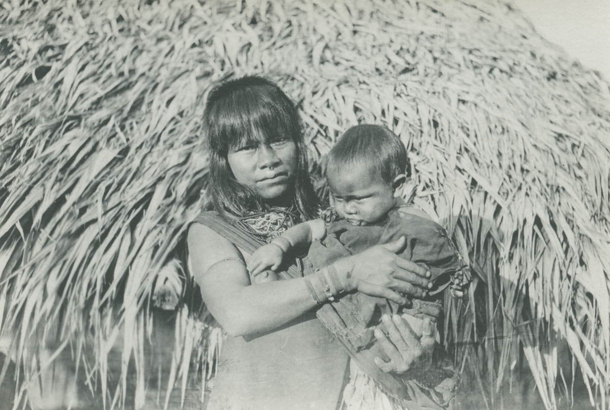 Fotografi från expedition till Peru 1920. Porträtt av kvinna med barn i famnen framför hydda med halmtak.