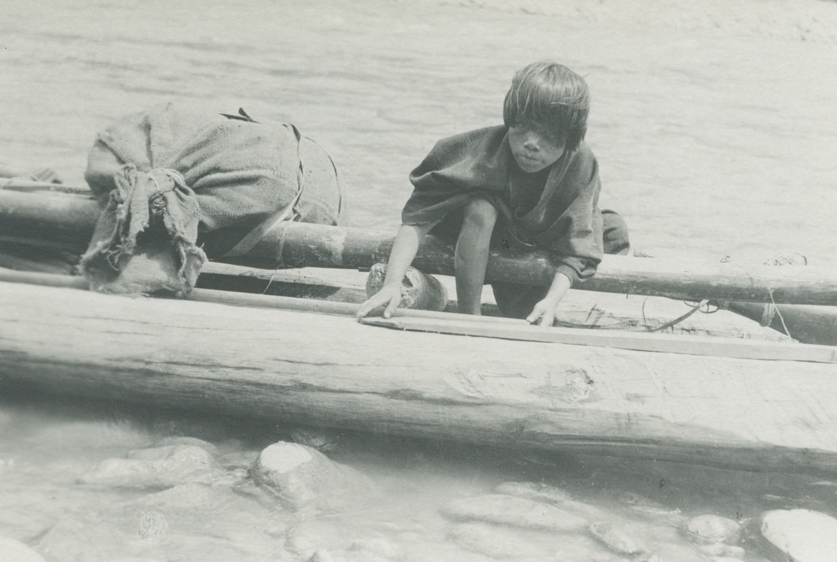 Fotografi från expedition till Peru 1920. Motiv av pojke med kanot vid flod.