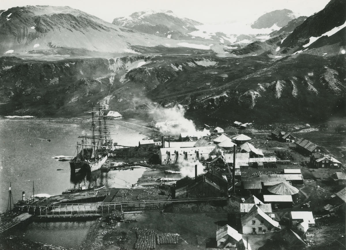 Bild från expedition i Antarktisområdet. Vy över Grytviken och båtarna "Tijuca" och "Louise".