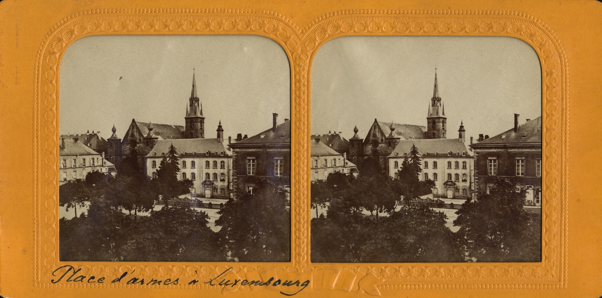 Stereobild av kyrkan Place d'Armes i Luxembourg.