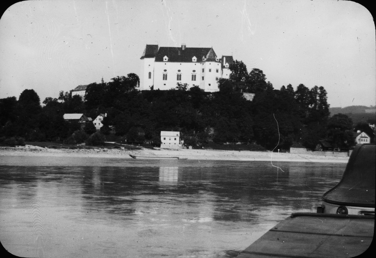 Skioptikonbild med motiv av slott sett från färd på Donau.