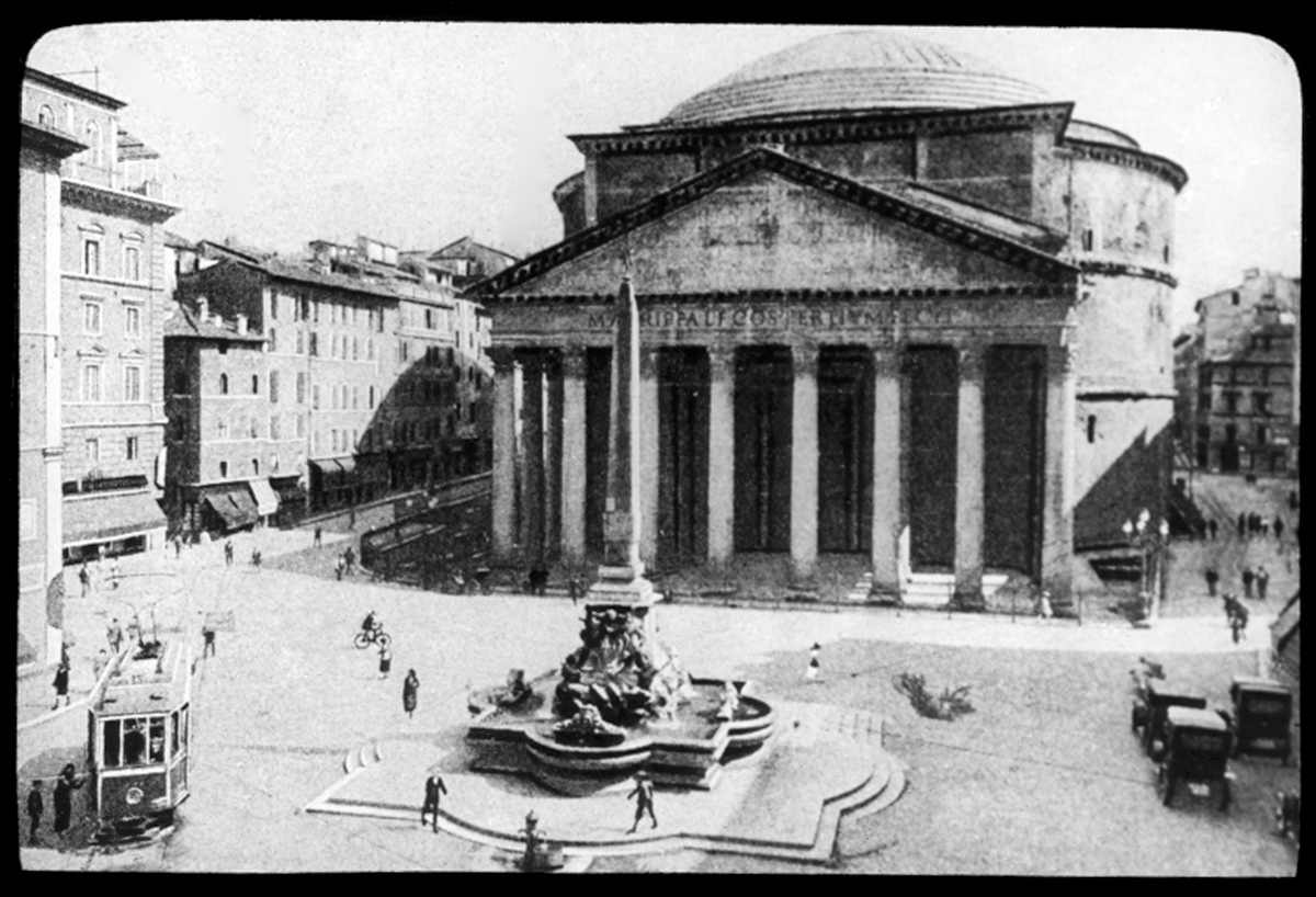 Skioptikonbild från institutionen för fotografi vid Kungliga Tekniska Högskolan. Motiv föreställande Pantheon i Rom, Italien. Bilden är troligen tagen av John Hertzberg under en resa i Europa.