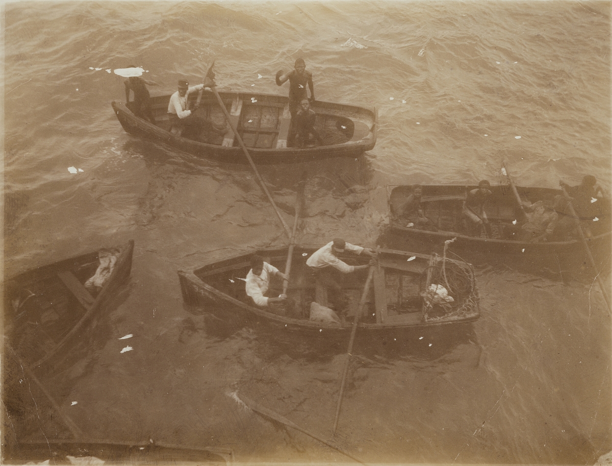 Fotografi från första svenska Antarktisexpeditionen 1901-1904. Motiv av ett antal män i roddbåtar av trä..