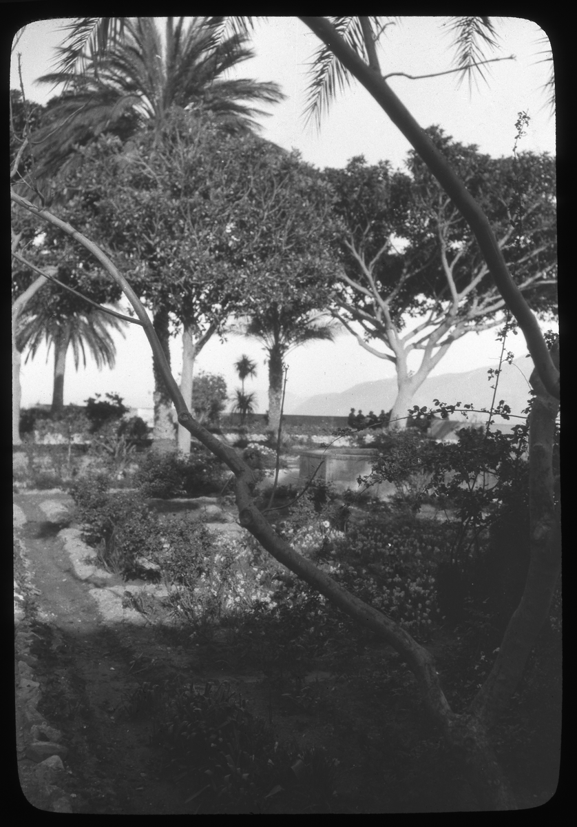 Skioptikonbild från institutionen för fotografi vid Kungliga Tekniska Högskolan. Bilden är troligen tagen av John Hertzberg under en resa i Europa. Hertzberg blev docent i fotografi 1921vid Kungliga Tekniska Högskolan i Stockholm. Park (troligen i södra Europa).