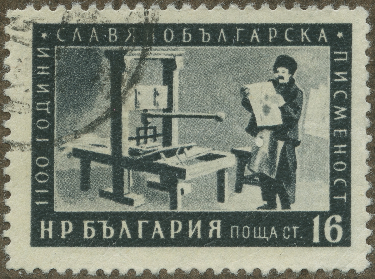 Frimärke från Bulgarien, 1955. Motiv av Enkel Tryckpress -11-te århundradet cyrilliska bokstäver-