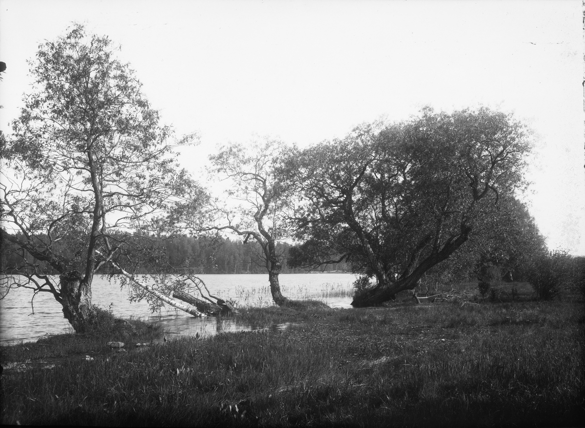 Diapostiv, fönsterbild med naturmotiv. Träd invid vatten.