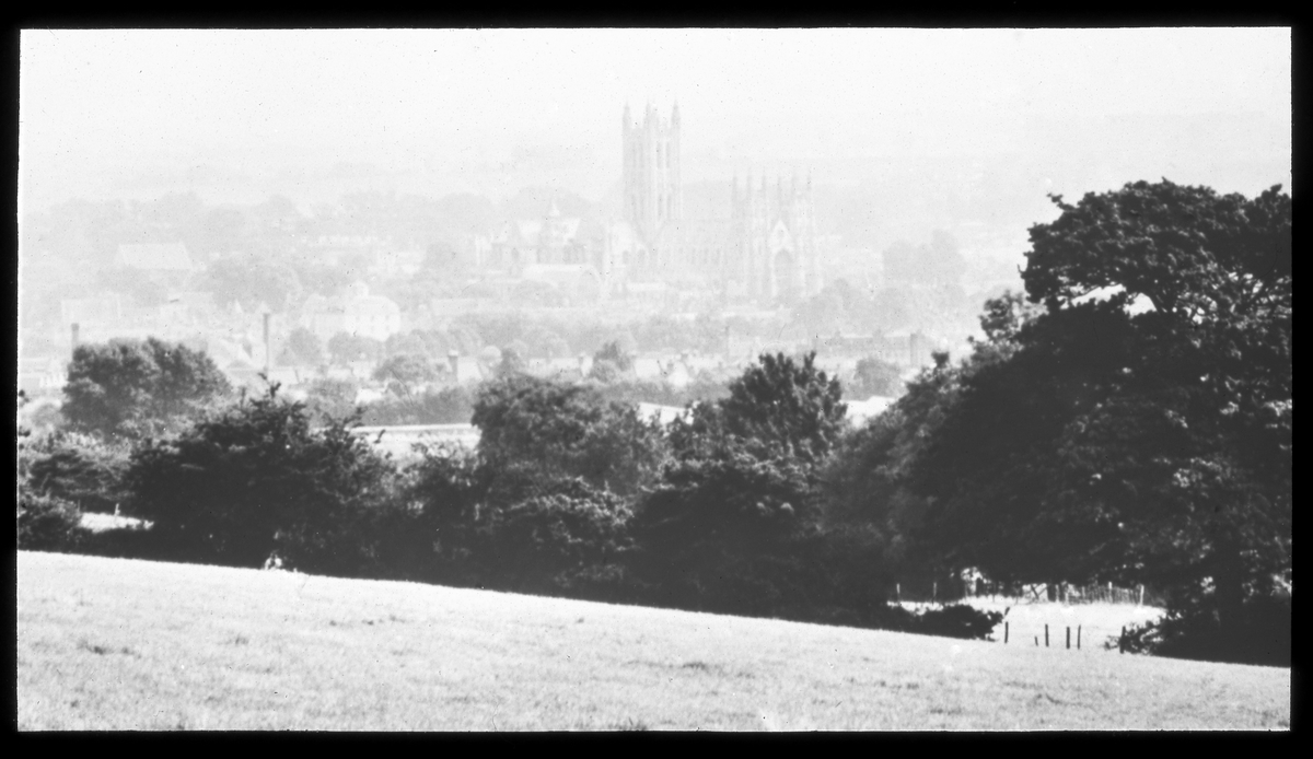 Skioptikonbild från institutionen för fotografi vid Kungliga Tekniska Högskolan. Använd av professor Helmer Bäckström som föreläsningsmaterial. Bäckström var Sveriges första professor i fotografi vid Kungliga Tekniska Högskolan i Stockholm 1948-1958. Motiv föreställande landskapsvy med kyrka i bakgrunden. På bilden står skrivet: Photograph on Ilford Panchromatic Plate.