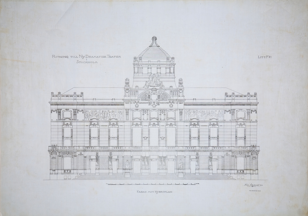 Dramatens fasad mot Nybroplan ritad av Fredik Lilljekvist 1904.