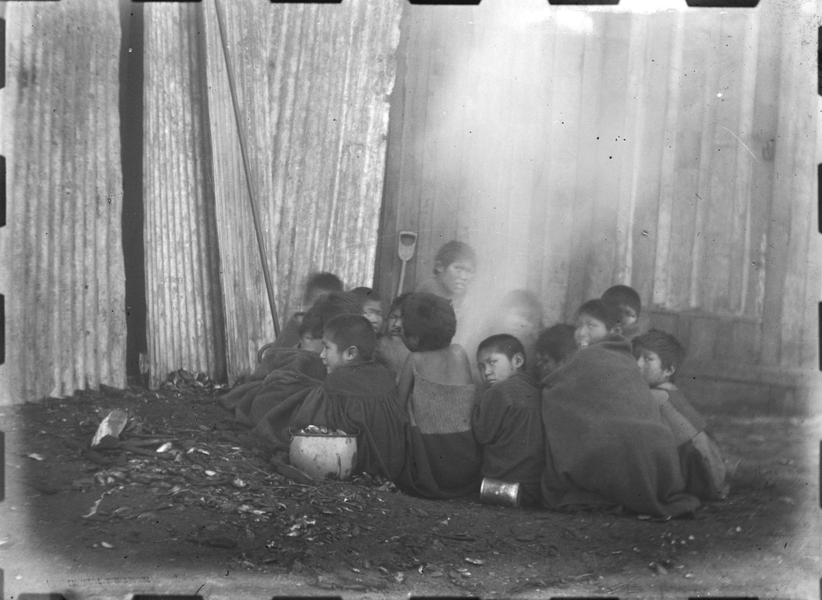 Fotografi från expedition till Eldslandet. Motiv av en grupp barn som sitter runt en lägereld.