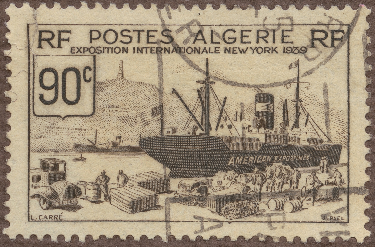 Frimärke från Algeriet, 1939. Motiv av Ångare inlastande varor för internat. Expon i New York, 1939