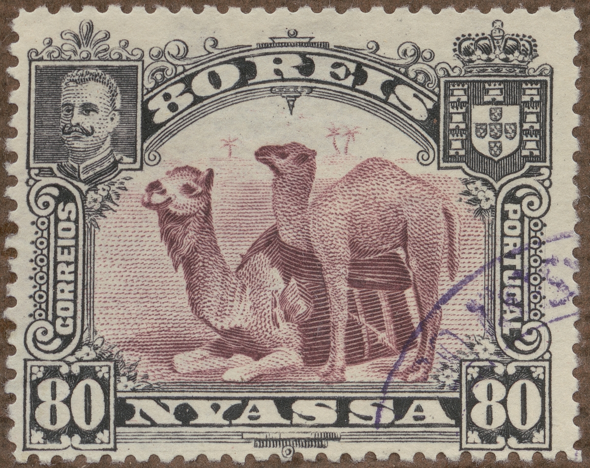 Frimärke ur Gösta Bodmans filatelistiska motivsamling, påbörjad 1950. Frimärke från Nyassaland, 1901. Dromedarer.