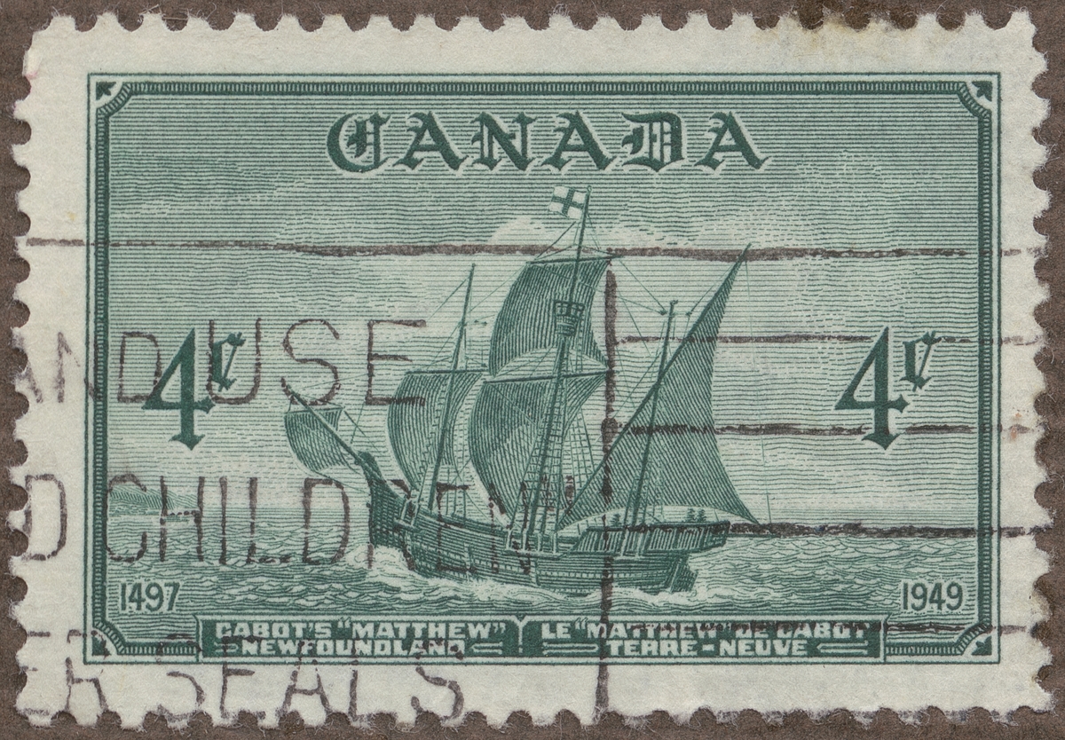 Frimärke från Canada, 1949. Motiv av John Cabot ombord på "Matthew" upptäcker 1497 New Foundland. Minne av New Foundlands inträde i den canadensiska unionen.-