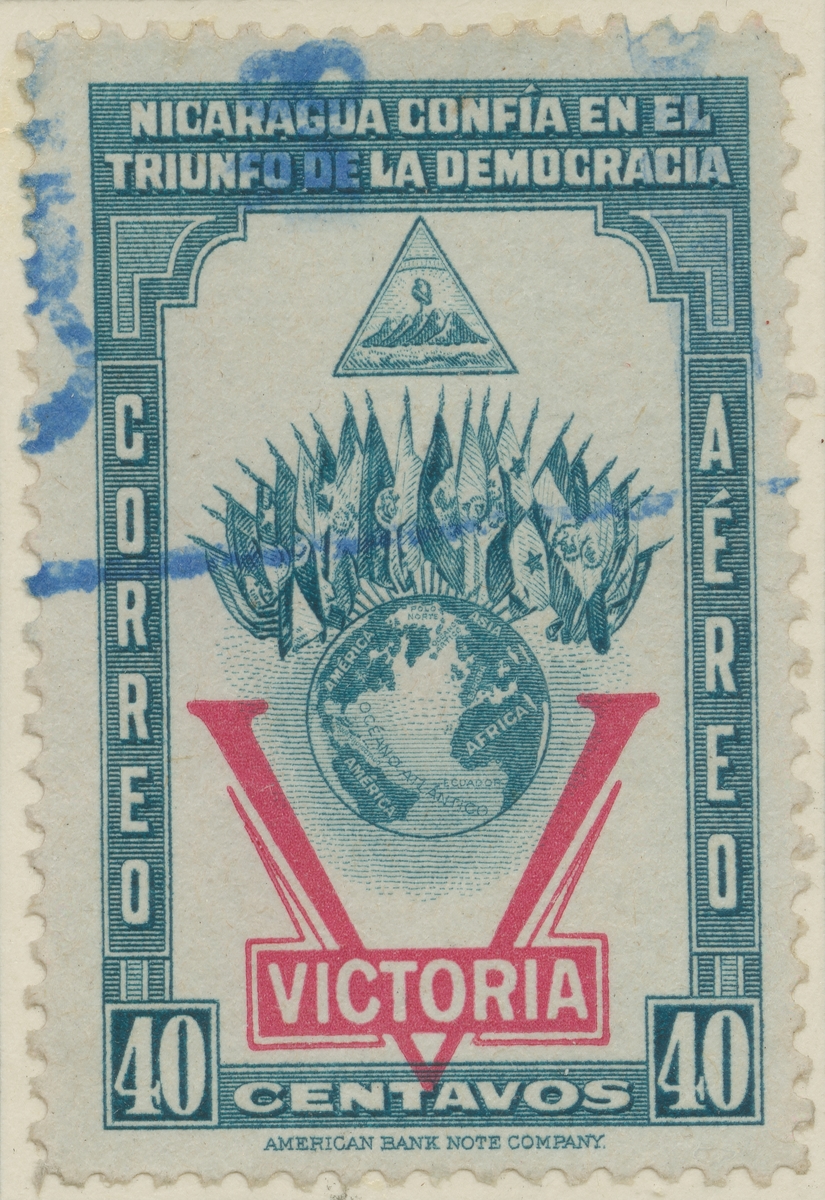 Frimärke från Nicaragua, 1943. Motiv av jordglob och flaggor. "Demokratiens segertecken. 2 -årsminne av Nicaraguas krigsdeklaration mot Axeln".