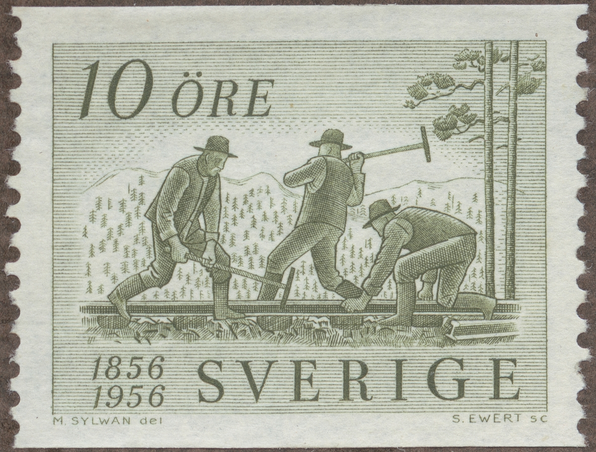 Frimärke ur Gösta Bodmans filatelistiska motivsamling, påbörjad 1950. Frimärke från Sverige, 1956. Motiv av Svenska järnvägsbyggare i arbete s.k. "Rallare" "S-J.-s 100-årsjubileum 1856-1956"