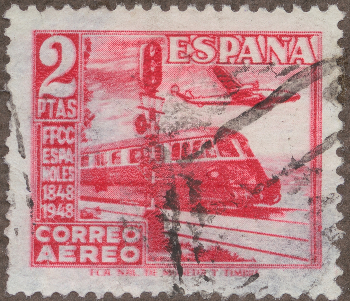 Frimärken ur Gösta Bodmans filatelistiska motivsamling, påbörjad 1950. Frimärke från Spanien, 1948. Motiv av Spanskt Diesel-lokomotiv Monoplan. " Spanska järnvägar 100 år: 1848- 1948"