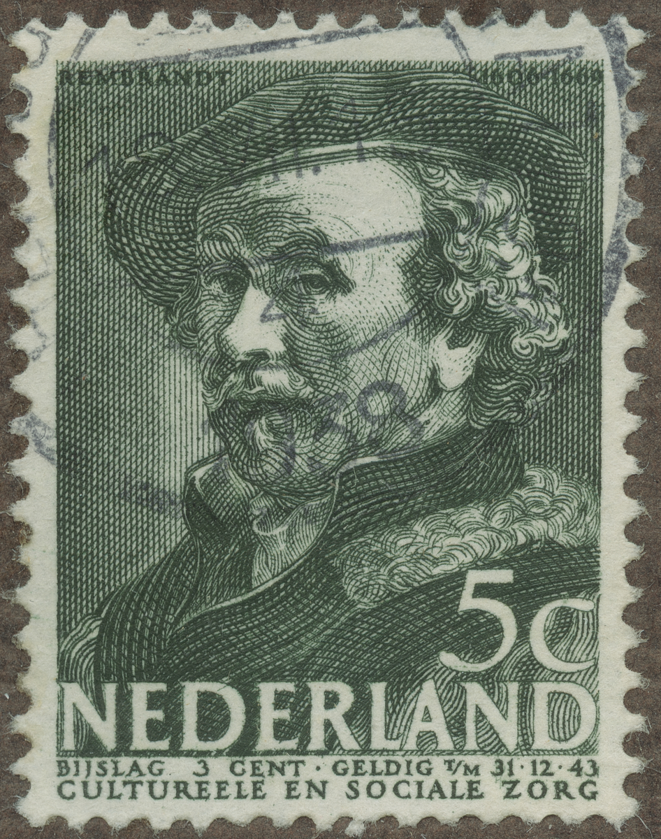 Frimärke från Nederländerna, 1938. Motiv av Rembrandt van Rijn 1606-1669 Målare Etsare