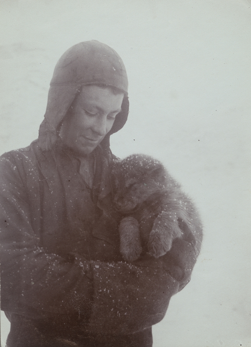 Fotografi från första svenska Antarktisexpeditionen 1901-1904. Motiv av besättningsmannen Åkerlund på Snow Hill som har en hundvalp i famnen.