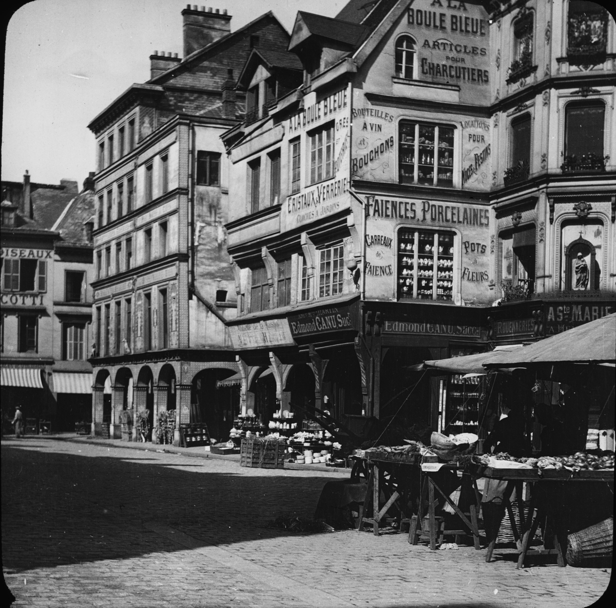 Skioptikonbild med motiv från handelsgata i Rouen.