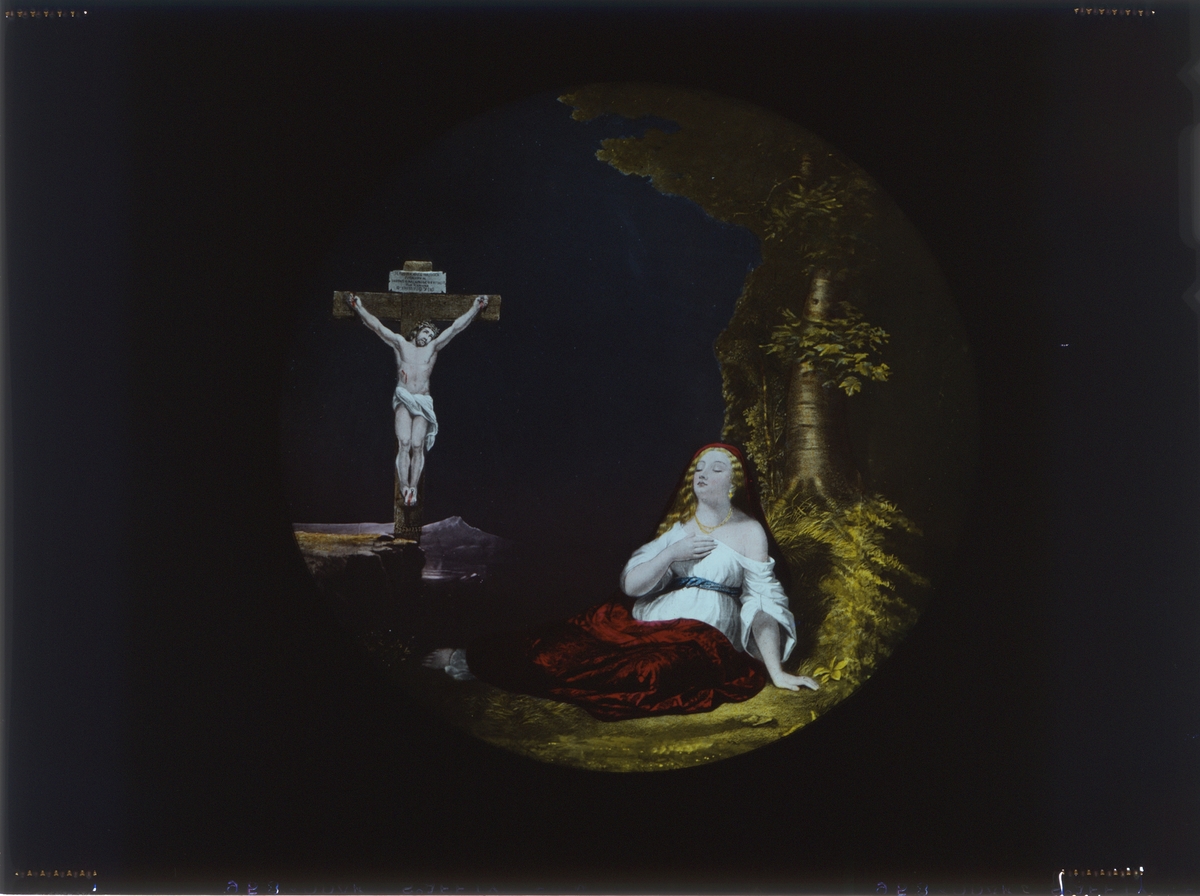 Skioptikon målad i färg på glasskiva.