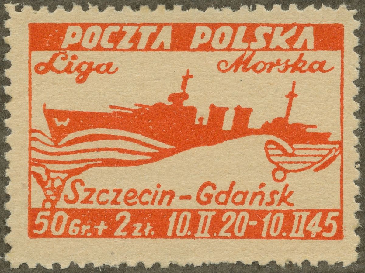 Frimärke från Polen, 1945. Motiv av Fraktångare, bestyckad Sjöfartsföreningen "Morska* 25 år 10.2.1920-10.2.1945