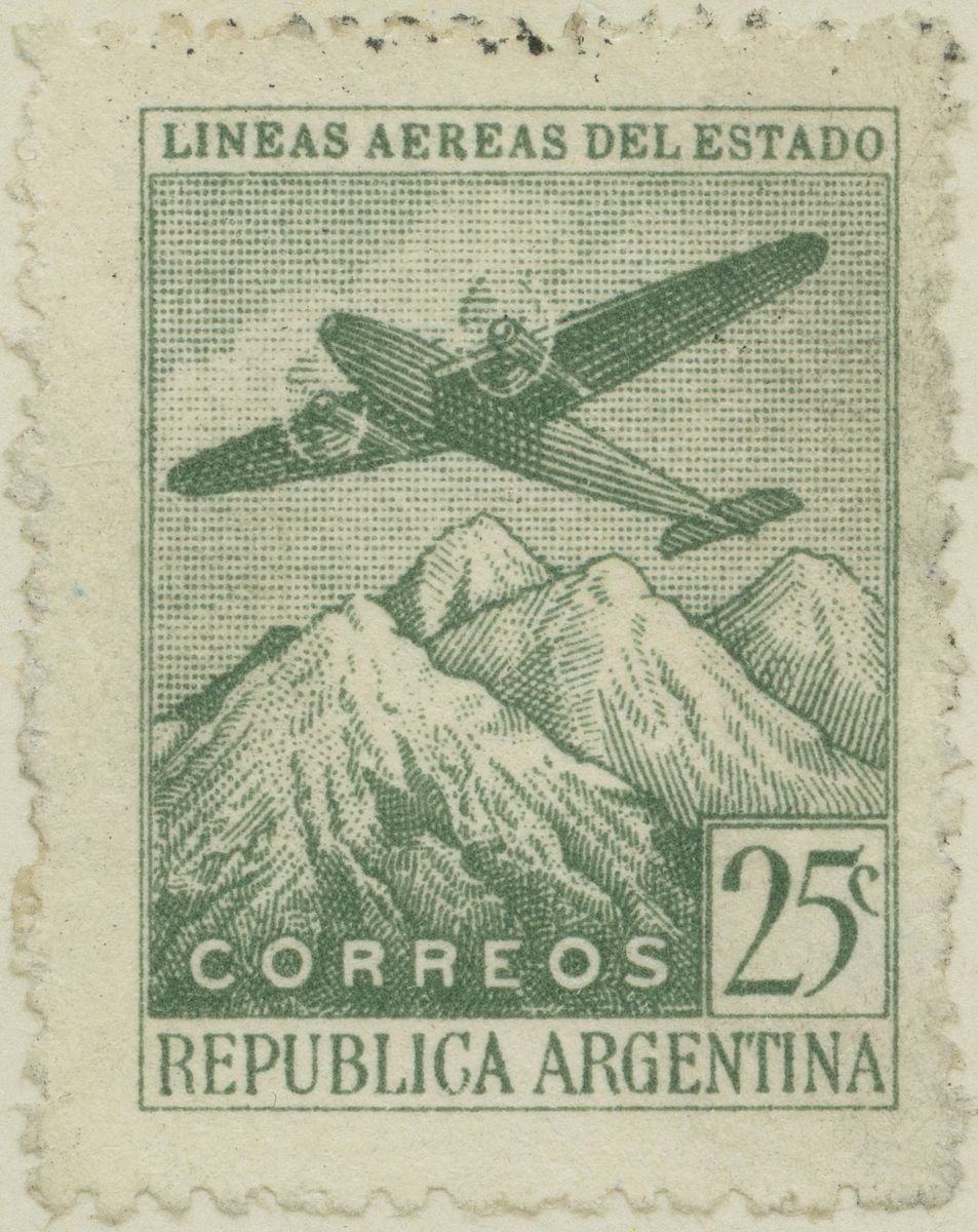 Frimärke ur Gösta Bodmans filatelistiska motivsamling, påbörjad 1950. Frimärke från Argentina, 1946. Motiv av Monoplan över Anderna