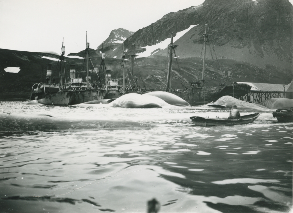 Bild från expedition i Antarktisområdet. Motiv av valfångststation med flera döda valar.