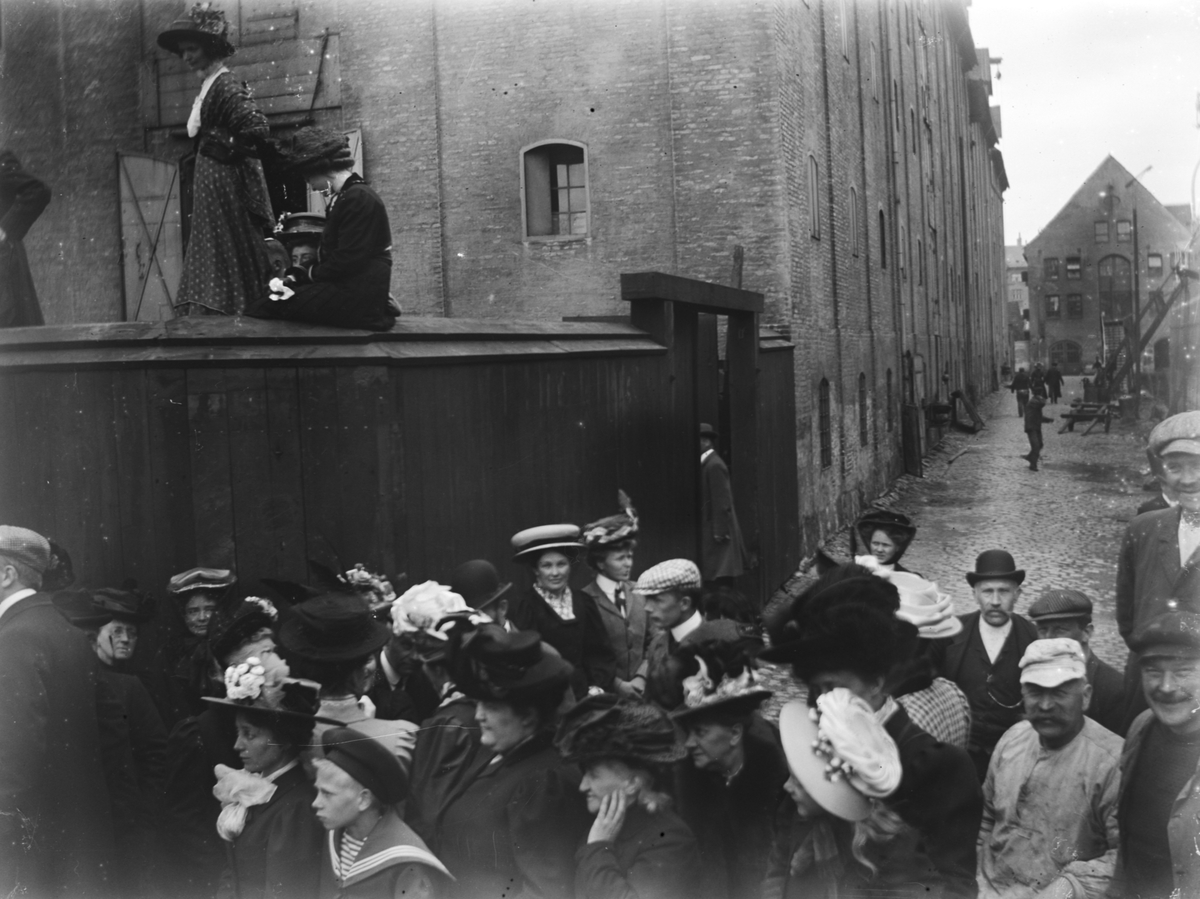 Fotografi från Grönland. Motiv av en grupp människor i stad.