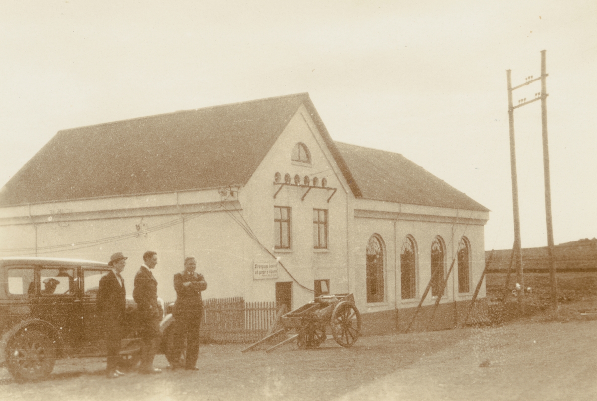 Fotografi från Albin Ahrenbergs resa till Grönland 1929. Motiv av tre män vid bil och hus.