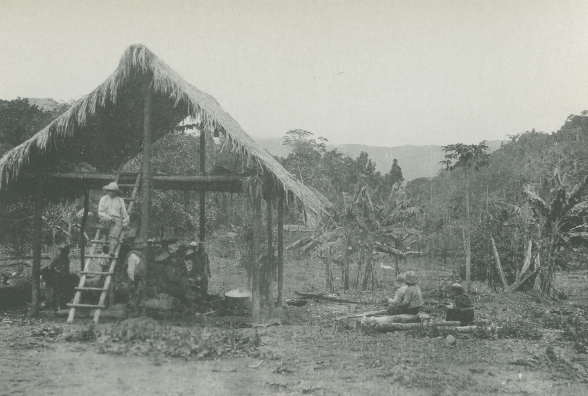 Fotografi från expedition till Peru 1920. Motiv av en grupp människor som vilar sig vid en hydda i djungeln.