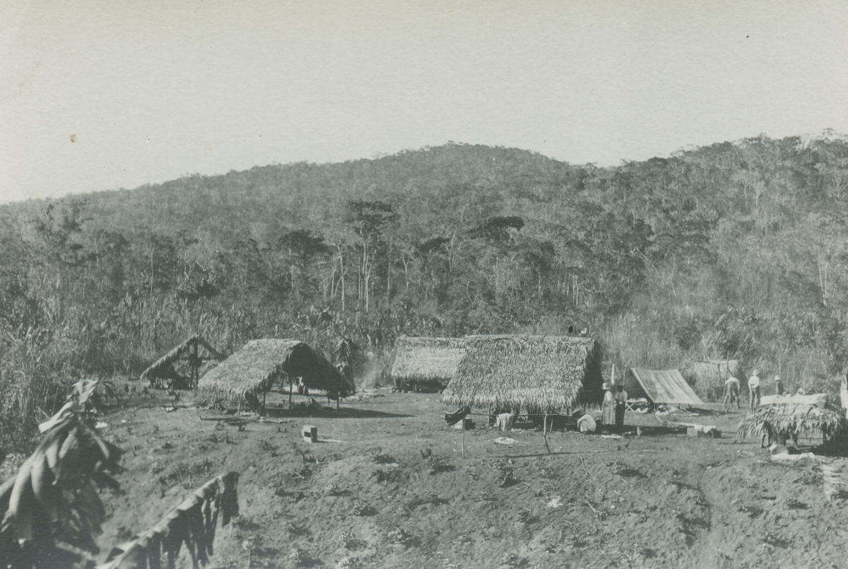 Fotografi från expedition till Peru 1920. Motiv av flera hyddor med halmtak belägna mitt inne i djungeln.