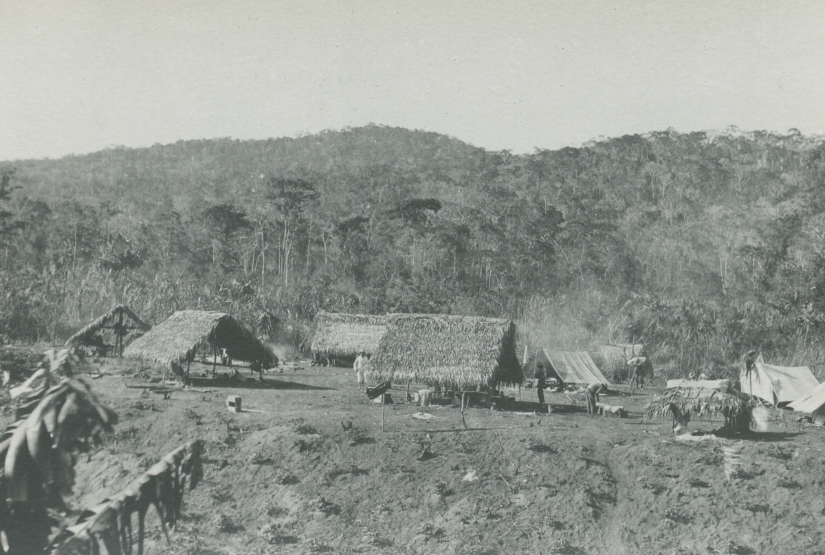 Fotografi från expedition till Peru 1920. Motiv av flera hyddor med halmtak belägna mitt i djungeln.