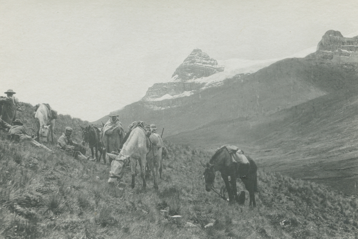 Fotografi från Peruexpedition 1920. Motiv av expeditionsdeltagare och hästar nedanför ett snötäckt berg.
