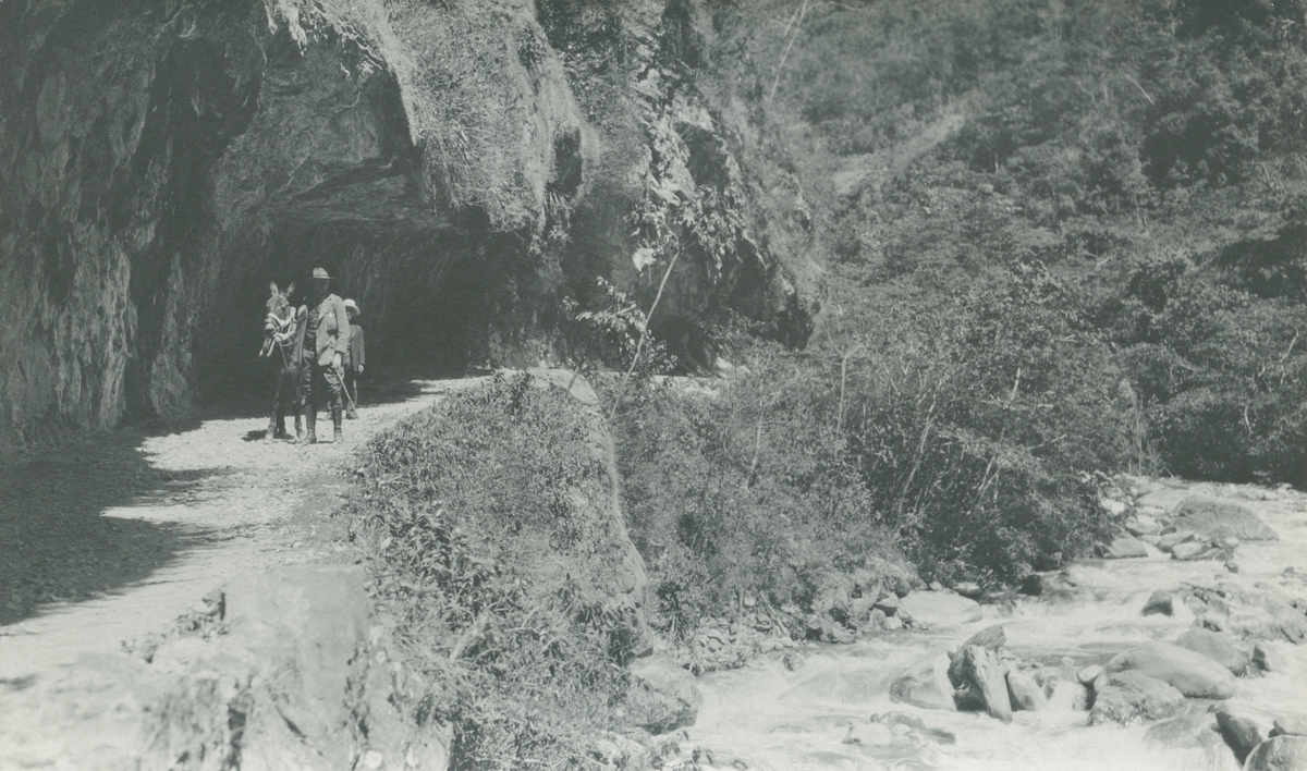 Fotografi från Peruexpedition 1920. Motiv av upptäcktsresande med häst eller mulåsna vid flod i djungeln.