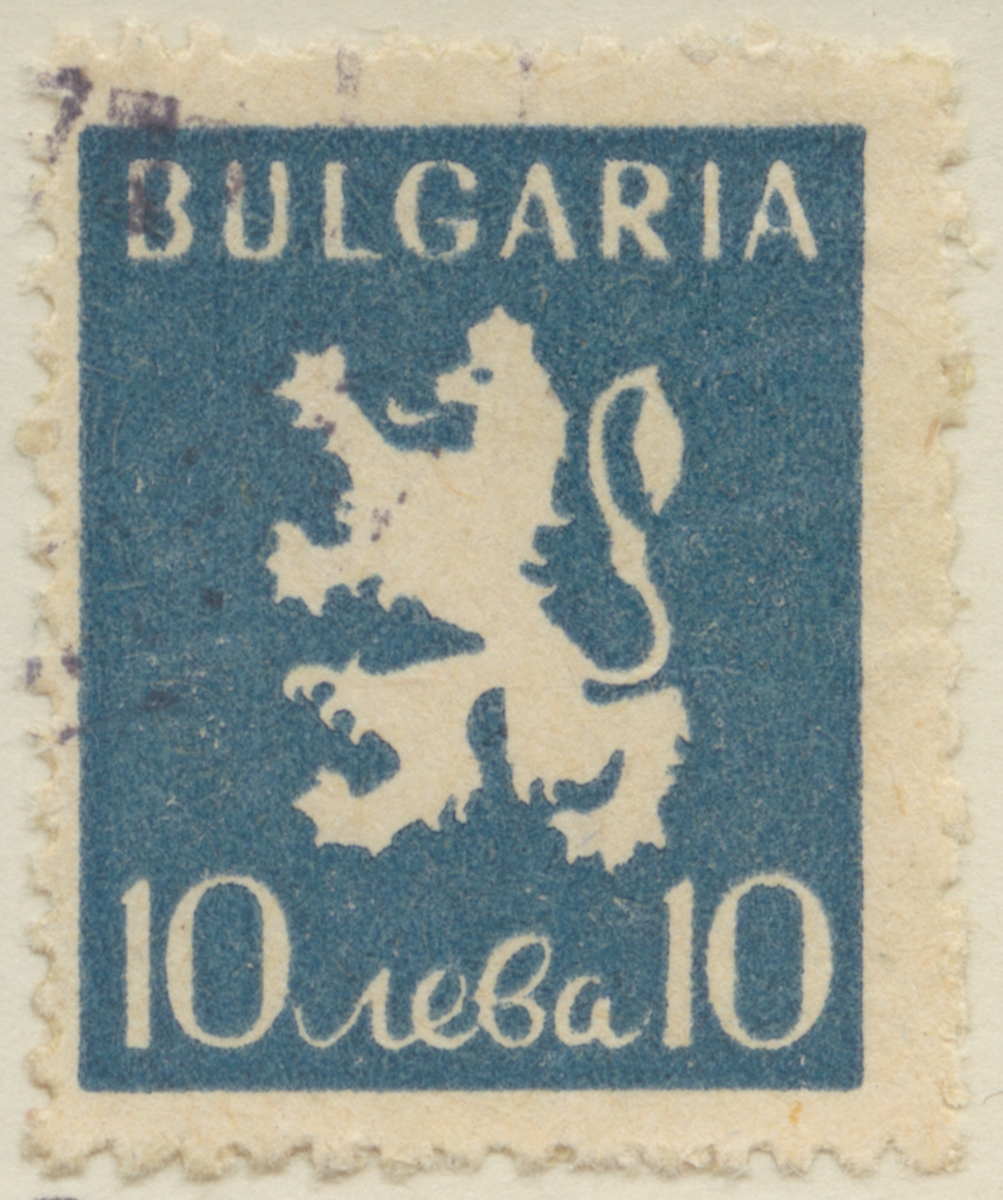 Titel: Frimärke ur Gösta Bodmans filatelistiska motivsamling, påbörjad 1950. Frimärke från Bulgarien, 1945. Motiv av Vapen Lejon