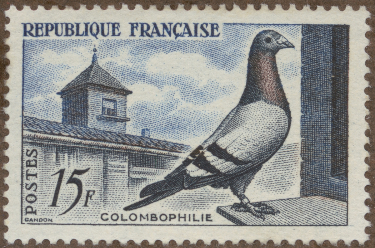 Frimärke från Frankrike, 1958. Motiv av Brevduva "Colombophile"