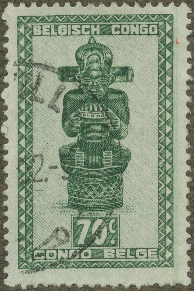 Frimärke från Belgiska Congo, 1948. Motiv av Träskulptur Avgudabild i träskulptur: konst av ursprungsbefolkning.