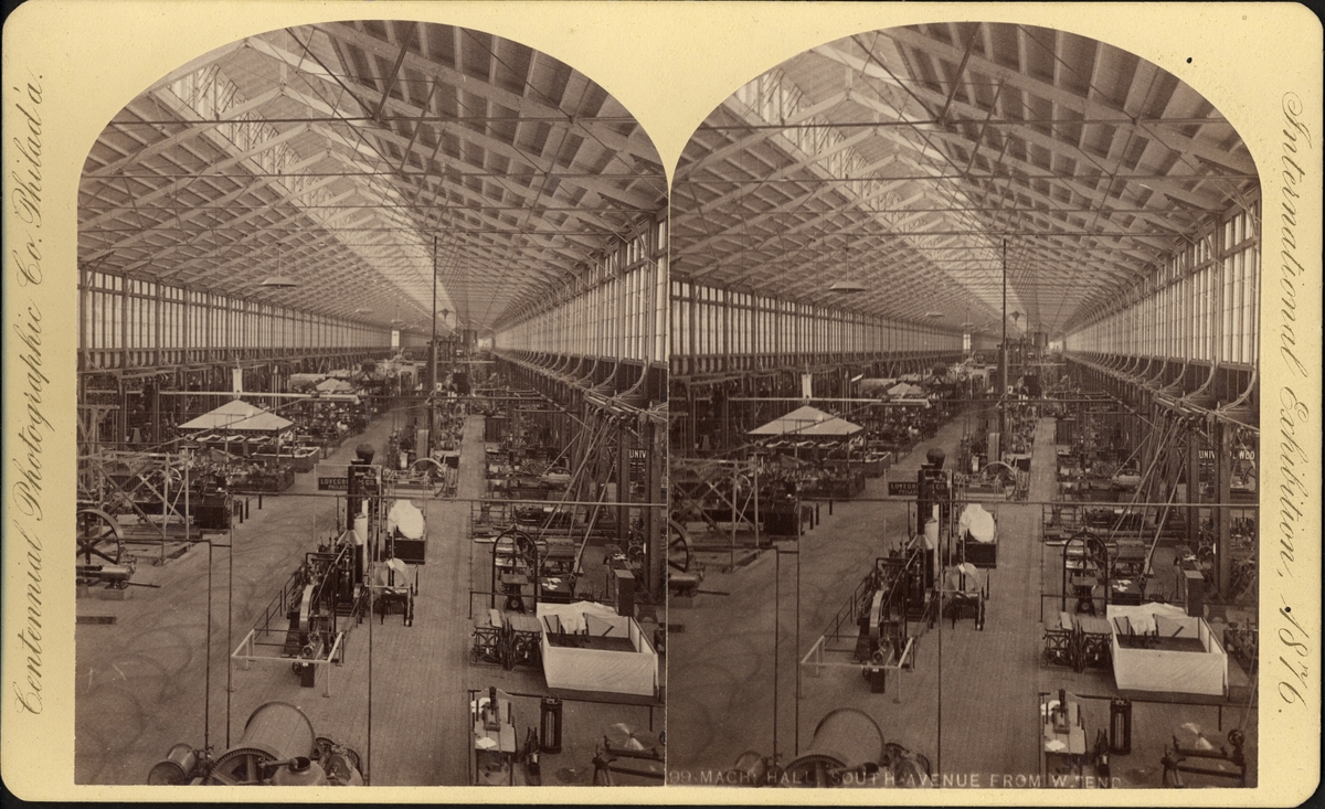 Stereobild, vy över maskinhallen, Centennial International Exhibition 1876.