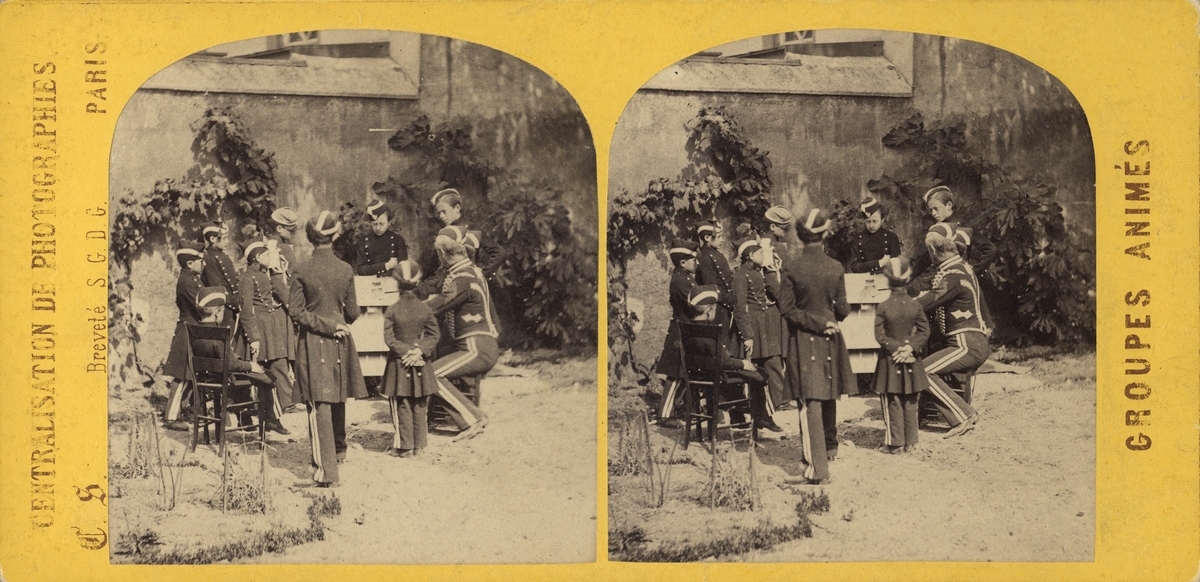 Stereobild av uniformsklädda pojkar kring uniformsklädd man.