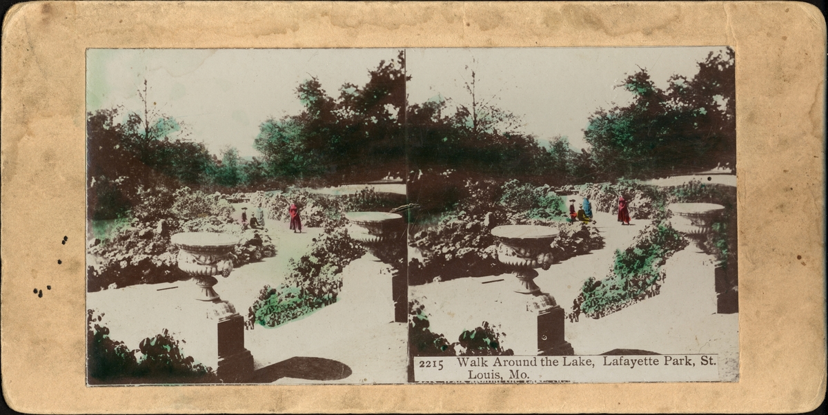 Delvis kolorerad stereobild, "promenad runt sjön", Lafayette Park, St. Louis.