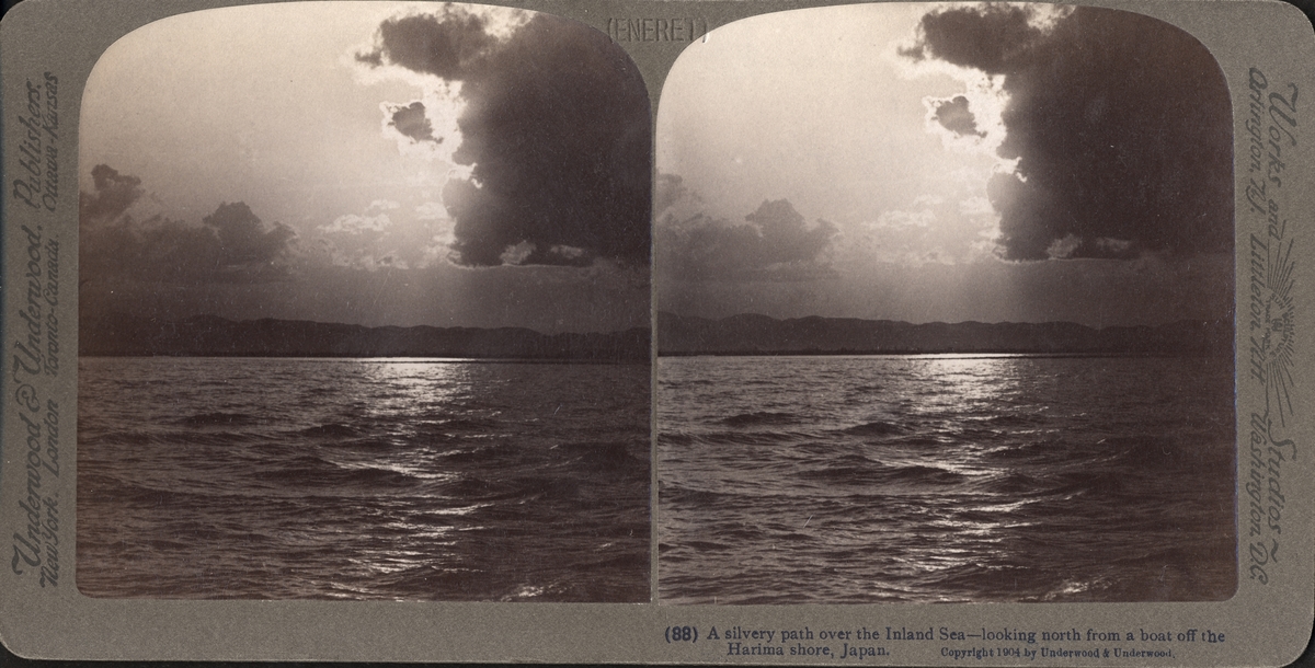 Stereobild, vy över The Inland Sea, sett från båt invid stranden i Harima.