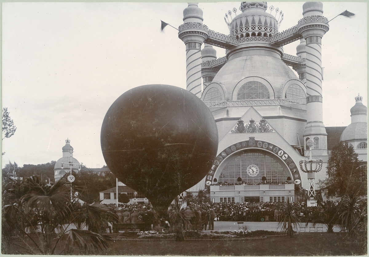 Luftballong utanför maskinhallen vid Allmänna Konst- och Industriutställningen 1897. Ballongen färdig på plats.