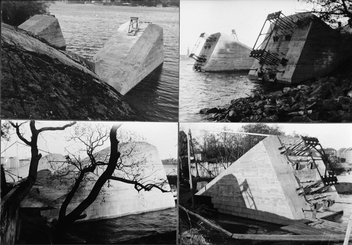 Byggherre: Byggnadsaktiebolaget Contractor, Stockholm. Färdiggjutna. Övre: landfästena sett från Långholmen. Undre: Landfästena sett från Kungsholmen.
