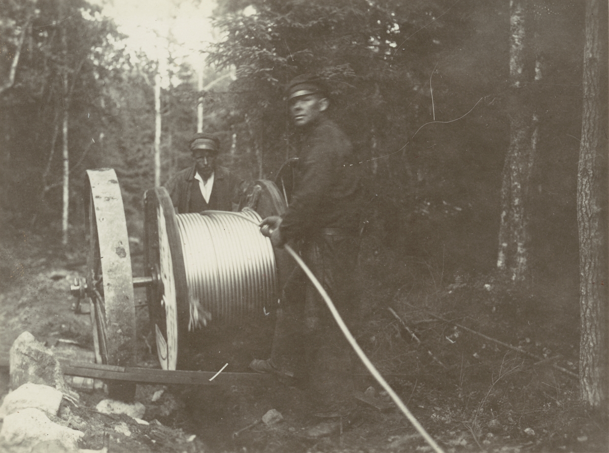 Finnvikskabeln. Kabelläggning vid Räfsnäs. Ur albumet Kabelarbetet Hjälmsälra (Hjälmsättra) - Norrtälje - Finnviken utfört under sommaren 1928.