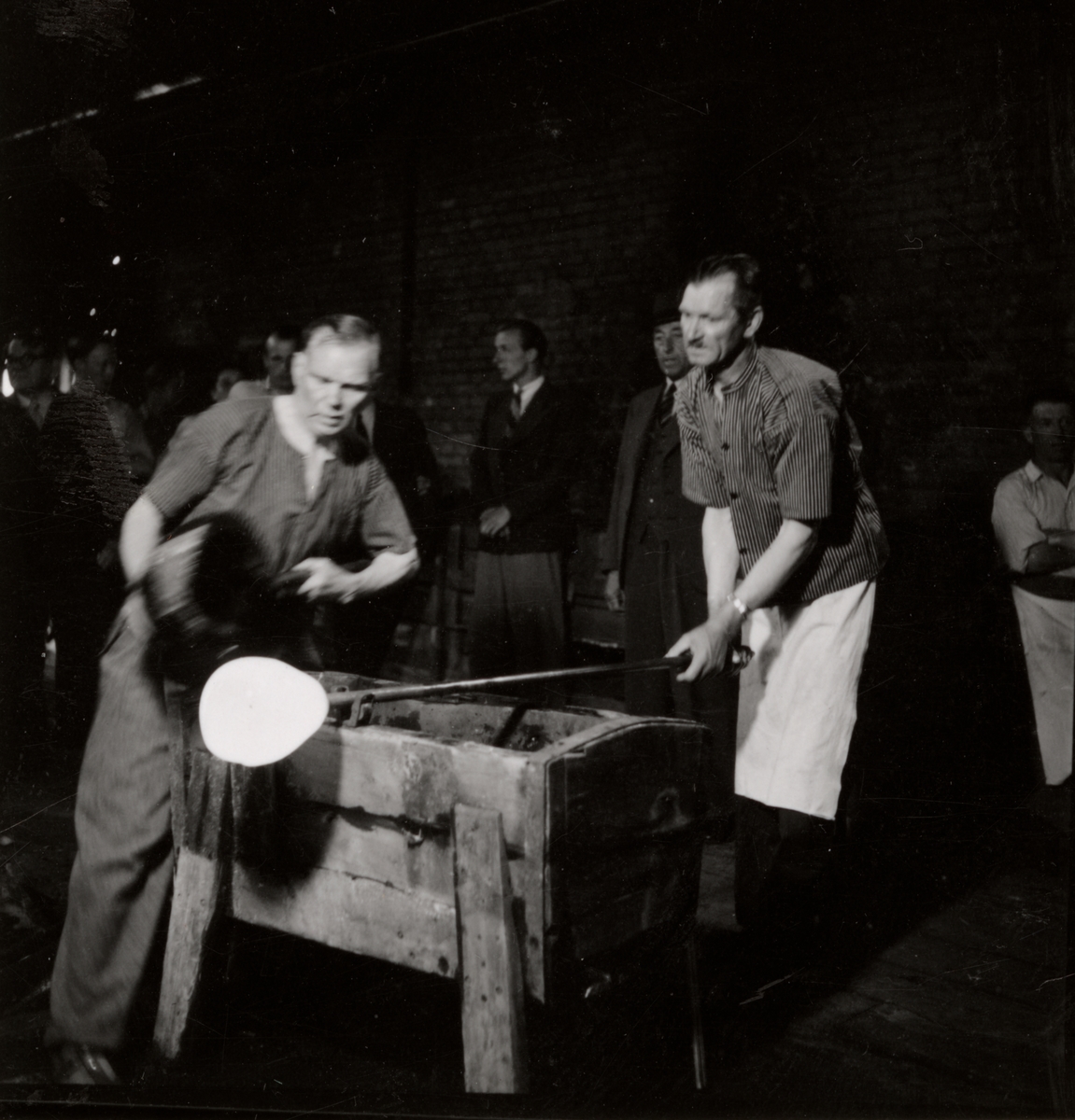 Fönsterglasblåsning i samband med filmning den 12 juni 1941. Anfångningen välsas.