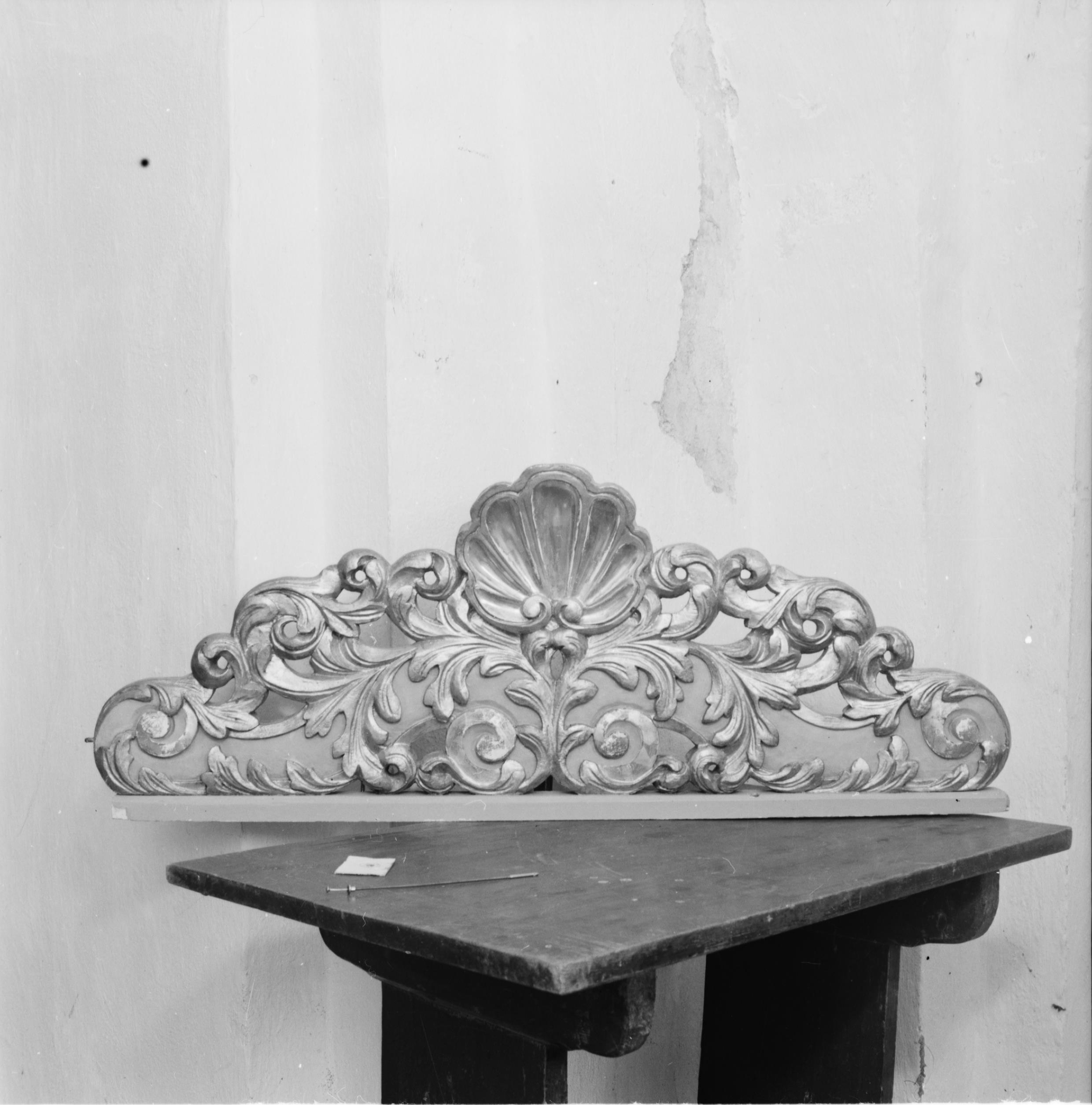 Överstycke av snidat och förgyllt trä. Har antagligen tillhört ett korskrank från 1710.