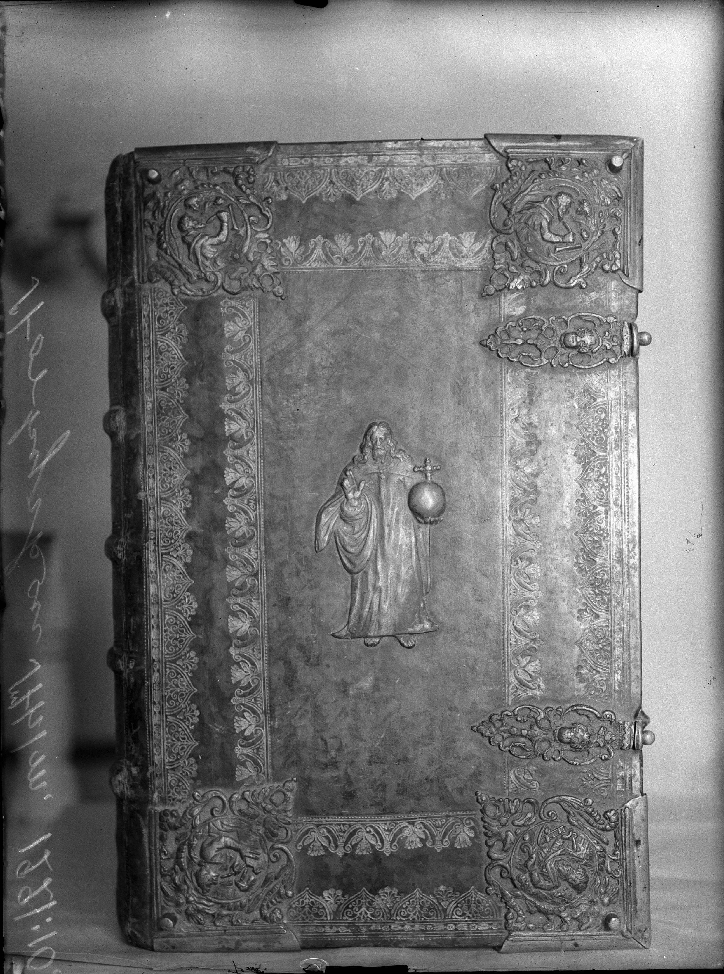 Bok, pärm med relief föreställande Kristus välsignande och hållande världsklotet.