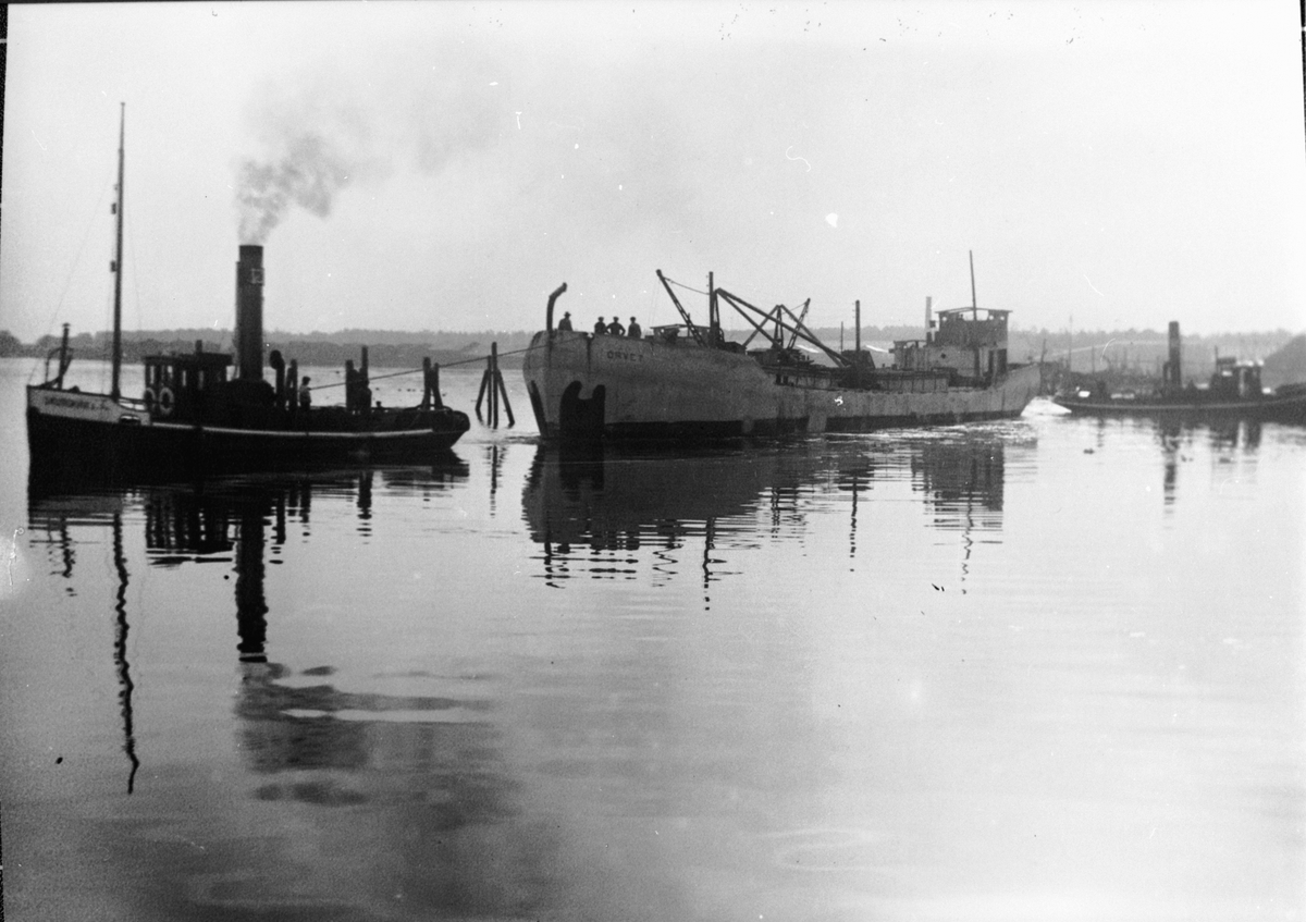Titel: Byggherre: Byggnadsaktiebolaget Contractor, Stockholm. Betongfartyg till kaj.