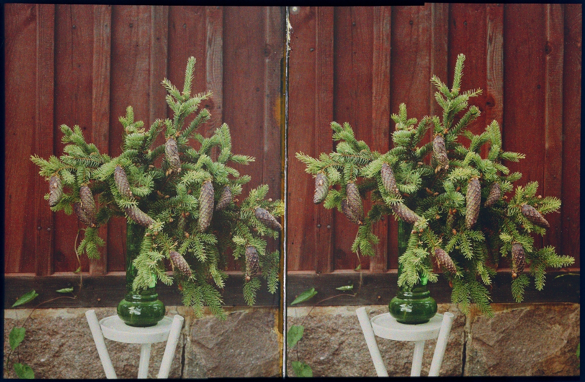 Lumières-stereo-autokromer. Stilleben, tallkvist med kottar i vas.