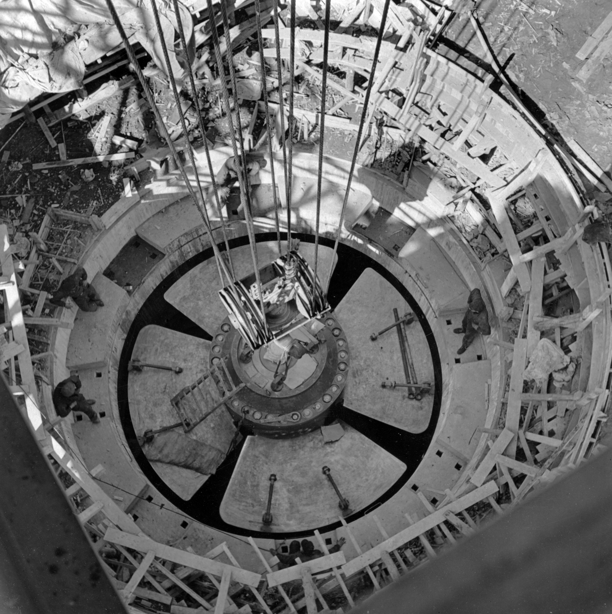 H = 12,5 meter, N = 29 200 hk och n = 94 varv/min. Löphjulsdiametern = 6.1 meter. Löphjulet är just på väg ned på sin plats i turbinschaktet.