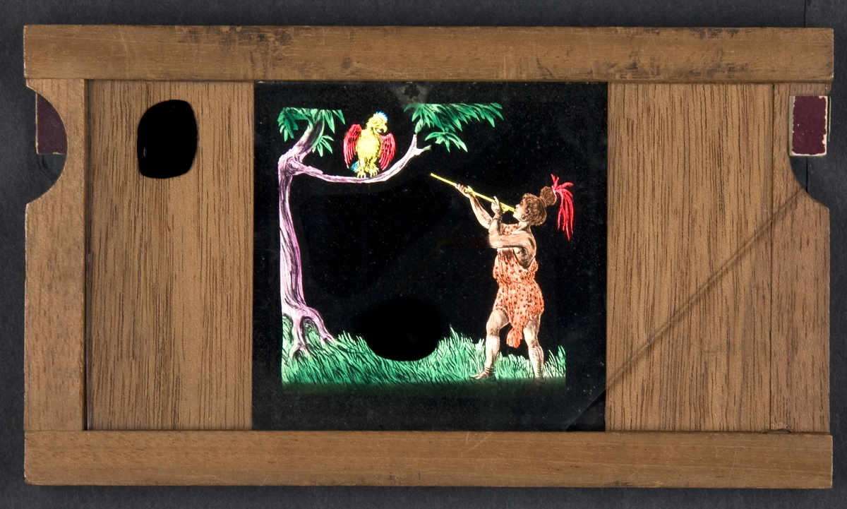 Laterna magica bild målad i färg på glasskiva.